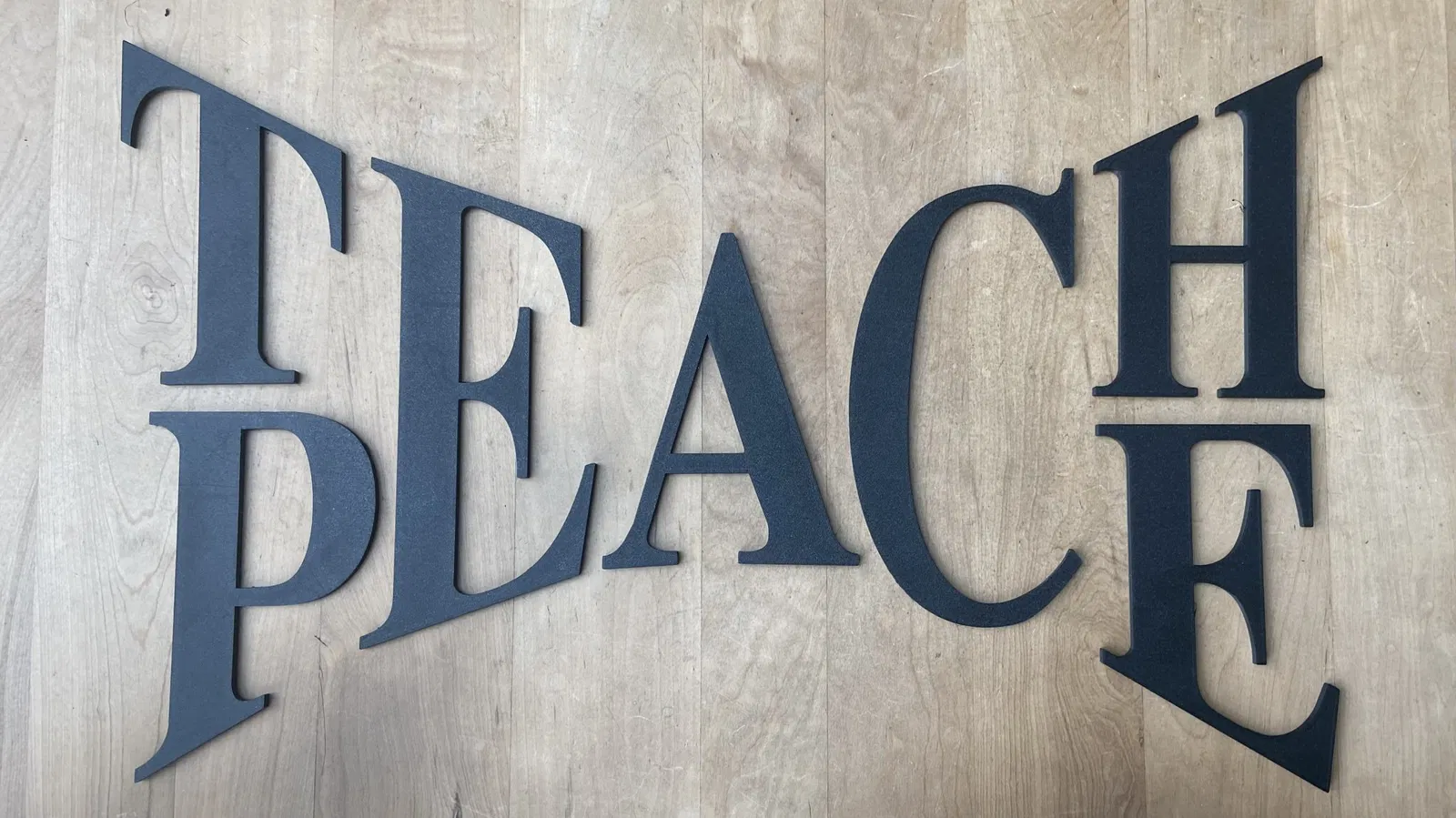 Đây là một bảng treo tường với các từ được nổi "Teach Peace". Tôi đã thêm hai phiên bản - một phiên bản hoàn chỉnh mà bạn in bằng hai màu khác nhau và phiên bản còn lại là các mục riêng lẻ tức là mỗi chữ cái là một tệp riêng biệt.