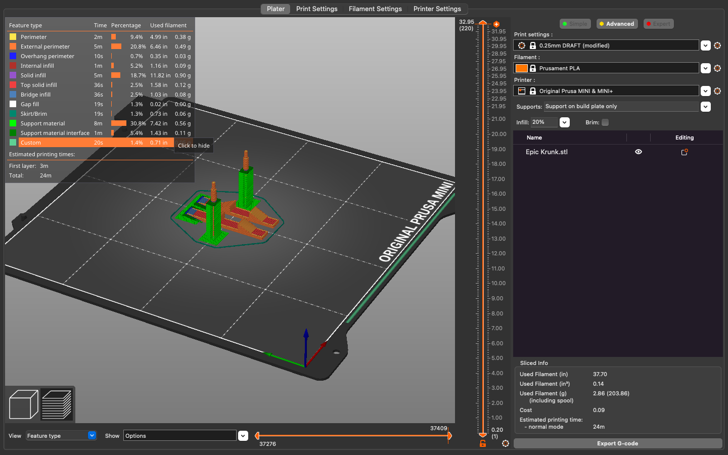 in với support nha! có chèn file gcode rồi, còn nếu in file stl thì nhớ bật support everywhere nha.
