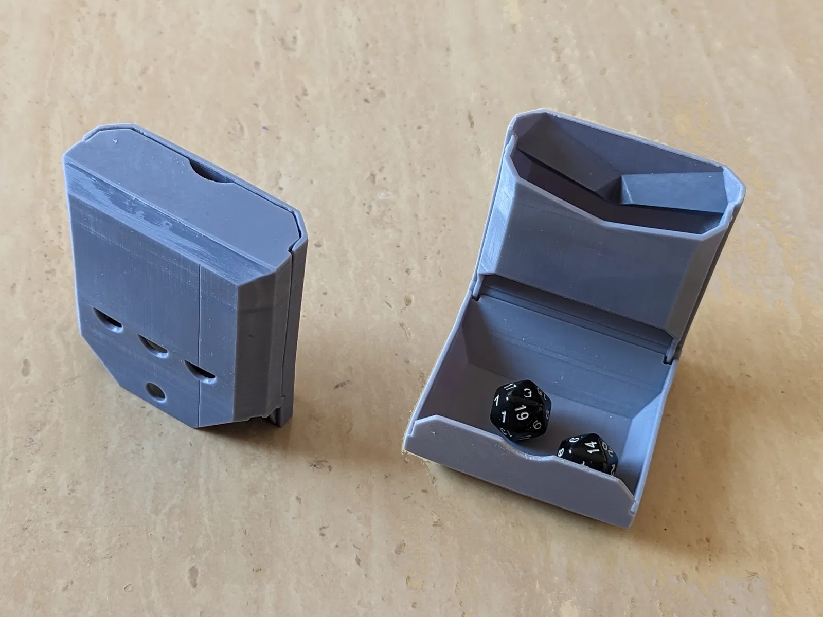 Phiên bản cập nhật của hộp tháp đổ xúc xắc D20 tương thích, có thể gấp lại sau khi in, kiêm luôn hộp đựng xúc xắc. Phiên bản này có khớp nối linh hoạt hơn để tránh bị gãy khi lắp ráp. Thích hợp in không cần support trên máy in resin.