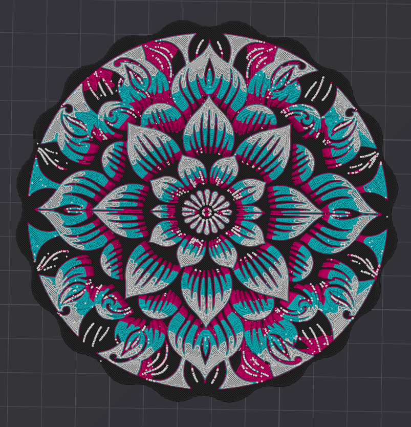 Một mẫu mandala hoa đối xứng. Dùng làm đế lót ly hoặc treo tường đều đẹp. Dễ dàng đổi màu bằng AMS hoặc tạm dừng in ở các lớp đổi màu mong muốn. Chỉ có 4 lần đổi màu trong suốt quá trình in.