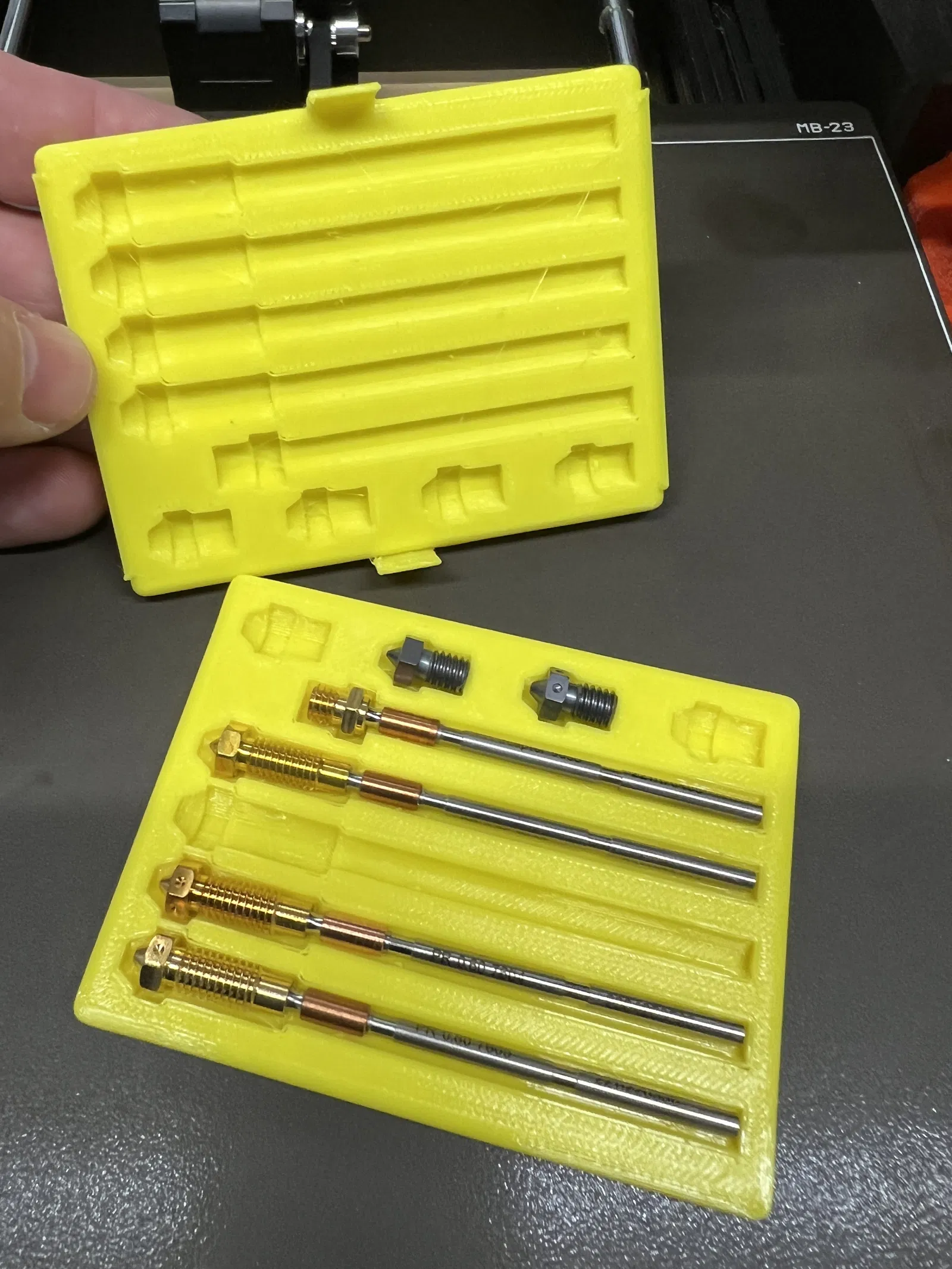 Đối với một số người, các lẫy trên nắp có vẻ hơi chặt khi in bằng PETG. Không cần in lại, chỉ cần hơ nóng bằng máy sấy khí nóng và bẻ cong chúng ra ngoài một chút.