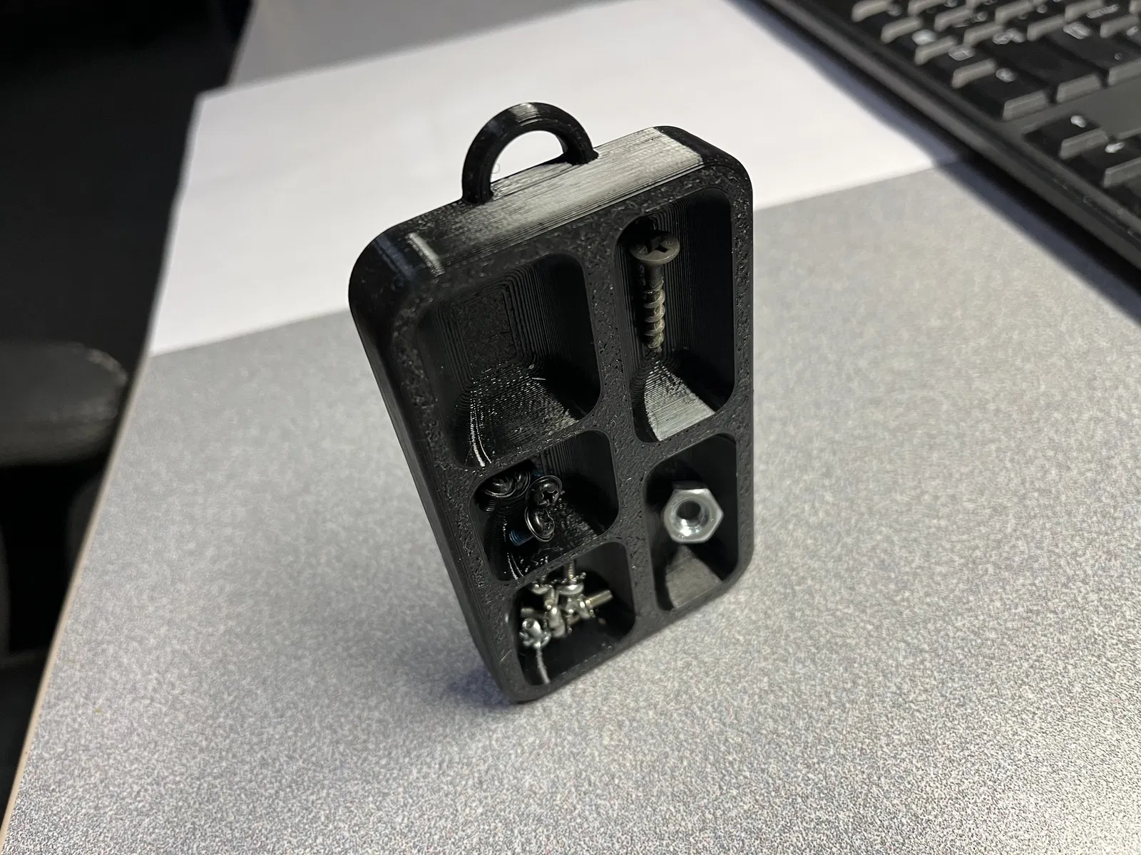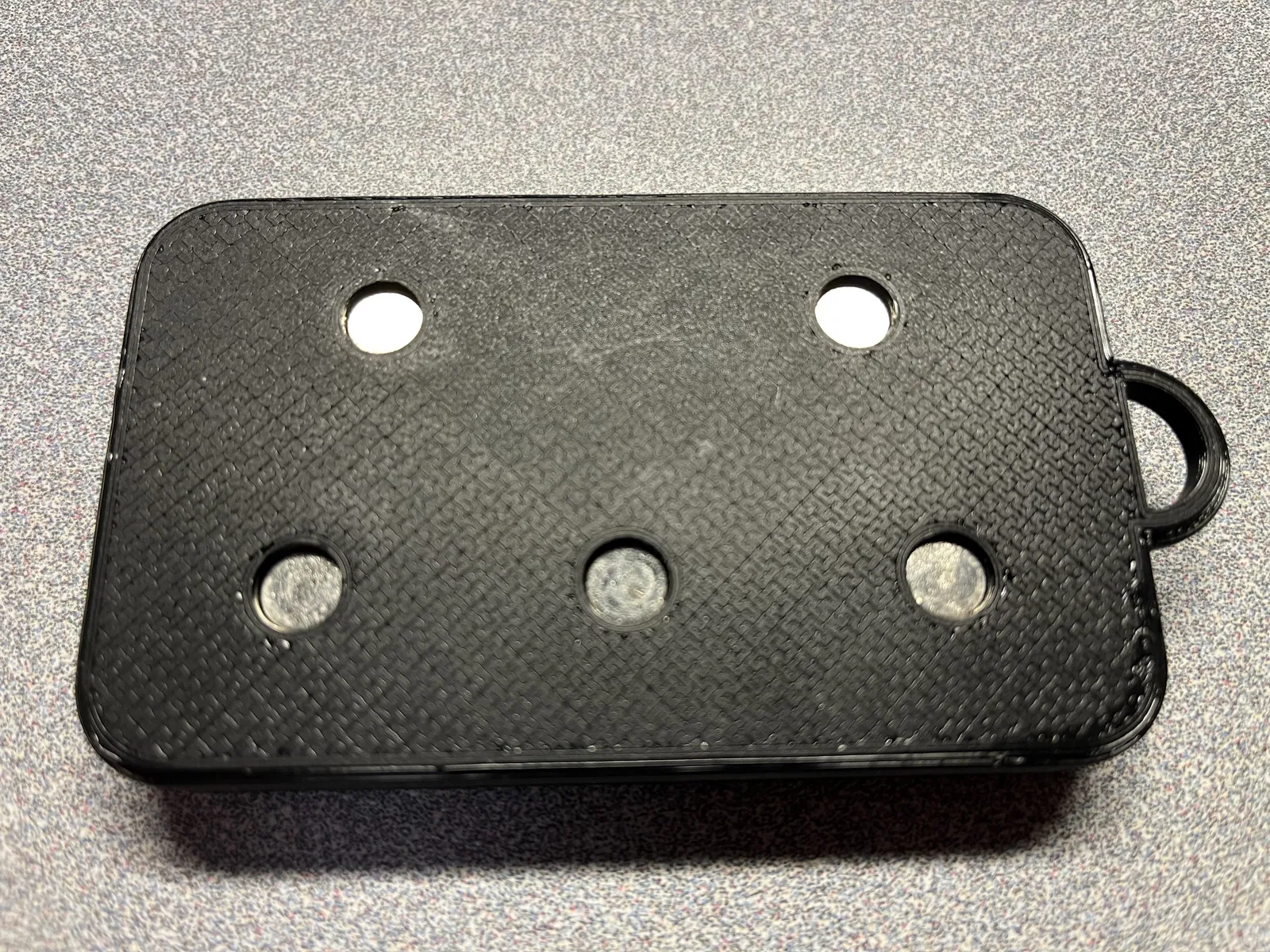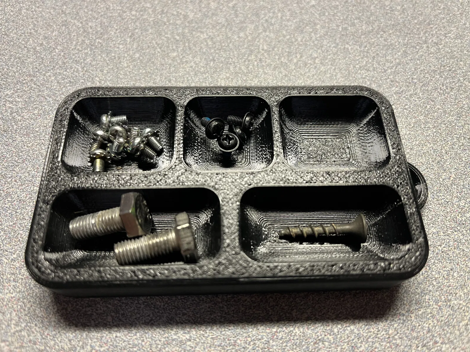 Cái khay này dài khoảng 4 inch x rộng 2.5 inch (chính xác là 100mmx60mm). Nó có năm ngăn với ba kích cỡ khác nhau (2 ngăn kích thước 42.5mmX20mm, 2 ngăn kích thước 30mmX25mm và 1 ngăn kích thước 25mmx25mm). Mặt dưới có khoét lỗ để gắn nam châm (lỗ rộng 8mm x sâu 4mm; loại nam châm cụ thể được sử dụng là mã #67488 của Harbor Freight) để đựng các vật bằng kim loại, nhưng bạn cũng có thể dùng nó để đựng hạt cườm hay bất cứ thứ gì khác. Có một cái vòng nhỏ để treo lên móc hoặc buộc dây để treo lên vật lớn hơn nếu cần.