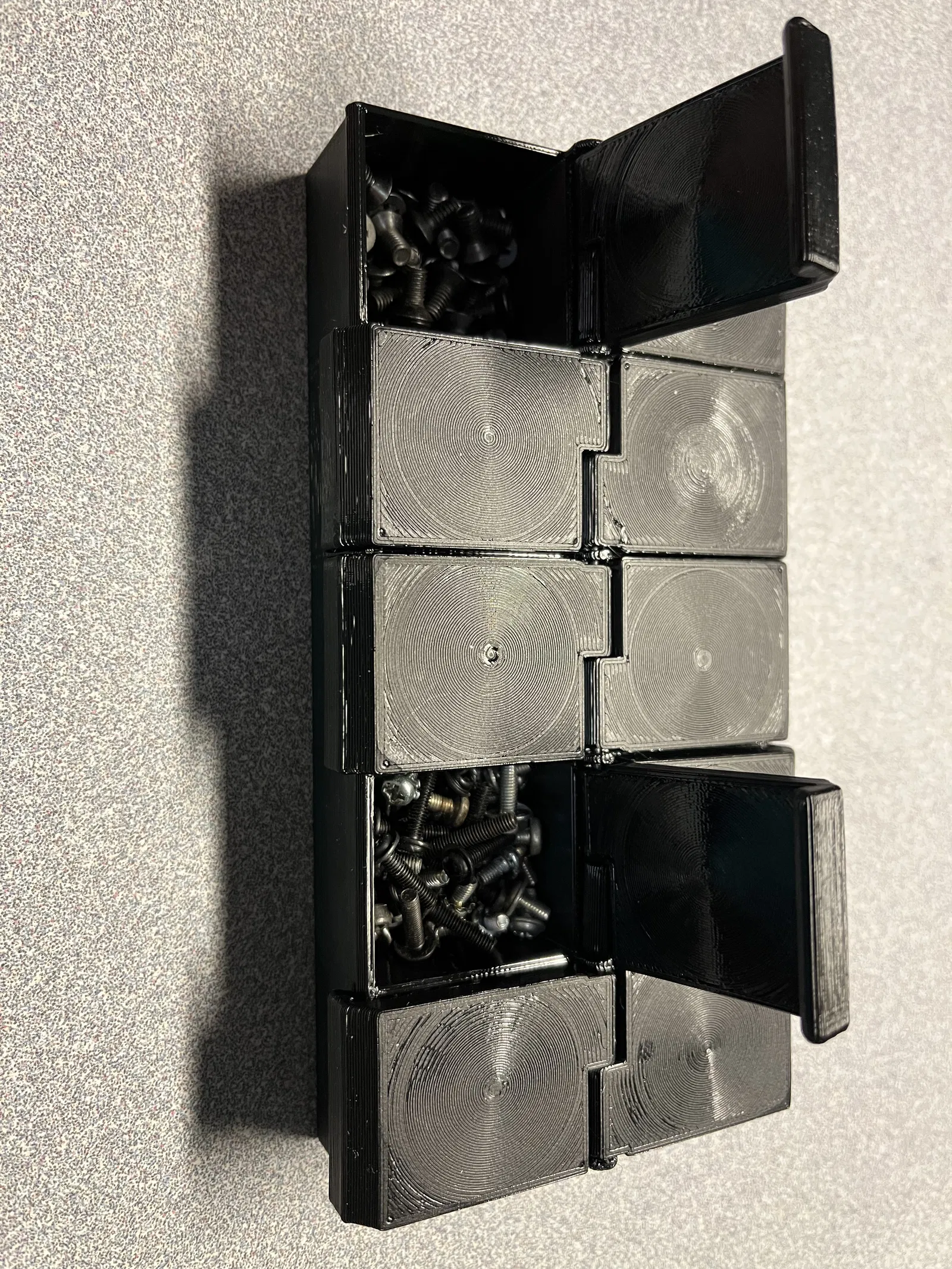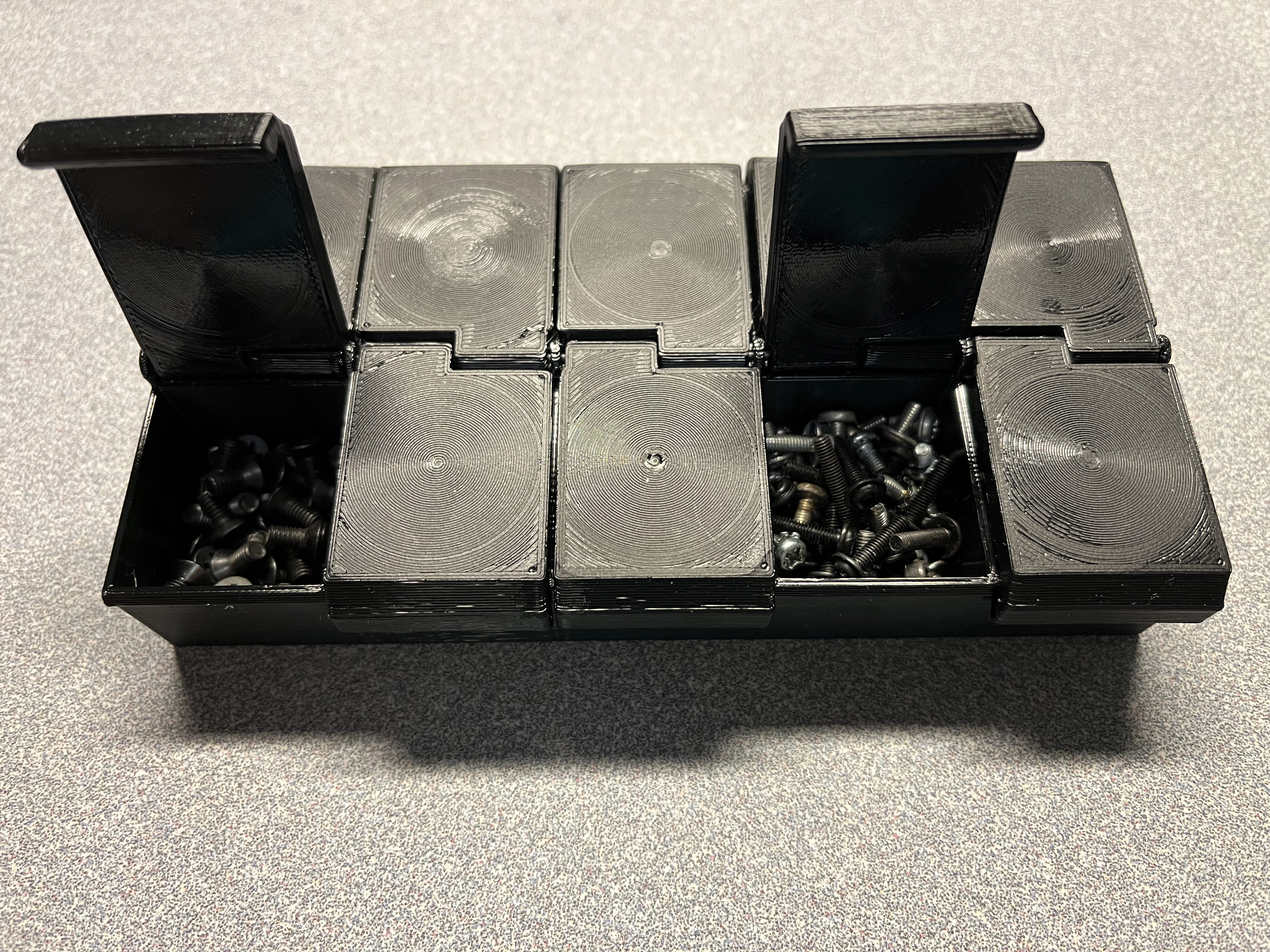 Hộp đựng nhỏ với 10 ngăn - rộng 30mm, dài 33mm, sâu 23.5mm - có nắp đậy chắc chắn. Kích thước ngoài 160x75x25mm. Bản lề dùng dây filament 1.75mm. Hoàn hảo để cất giữ ốc vít, hạt cườm hoặc các bộ phận nhỏ.