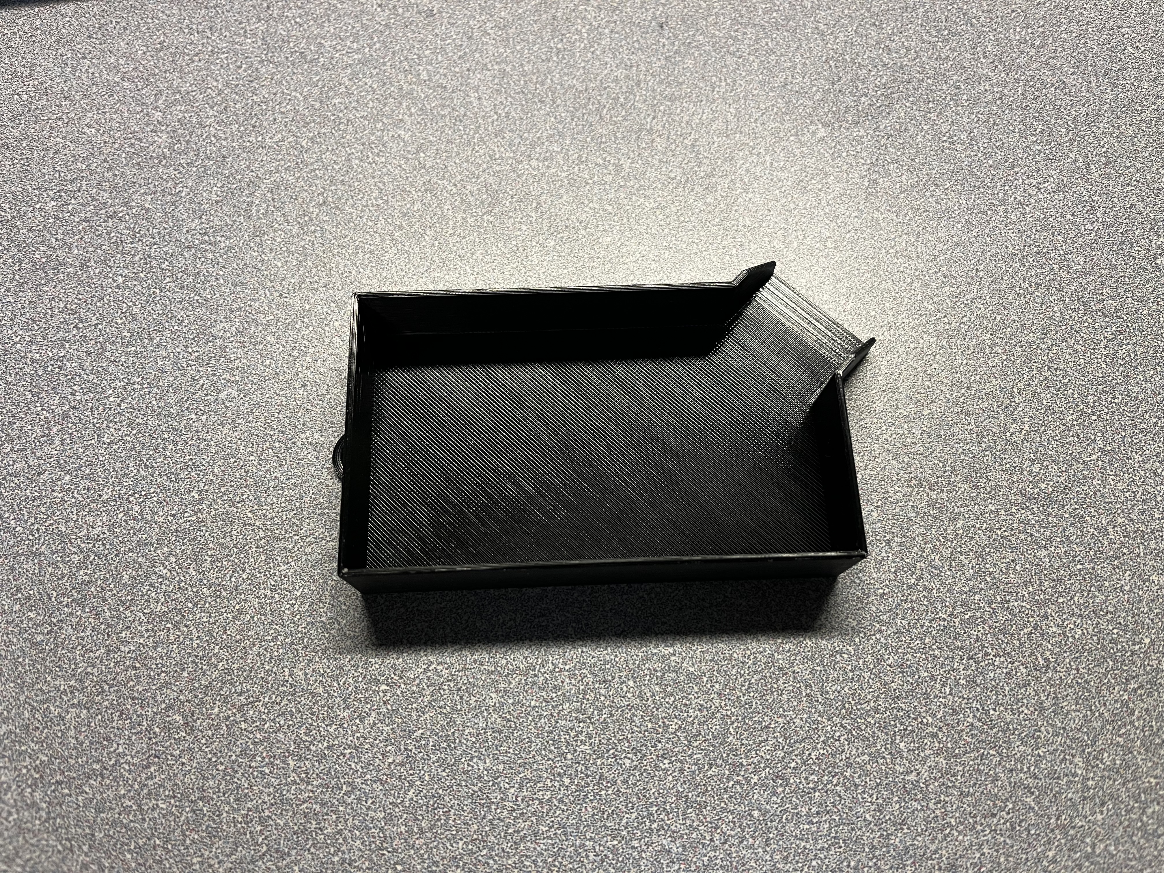 Cái khay này có cái phễu ở góc để dễ dàng đổ đồ vật nhỏ trở lại vào hộp. Khỏi cần cầu kỳ, cái khay này đơn giản vậy thôi. Diện tích chính khoảng 100mm x 60mm, còn cái miệng phễu rộng 30mm, dài 20mm. Miệng phễu có cái rãnh ở phía trước để dễ dàng quét đồ vật vào đó khi đặt trên mặt phẳng, hoặc để múc đồ lên bằng một cái hộp lớn hơn.