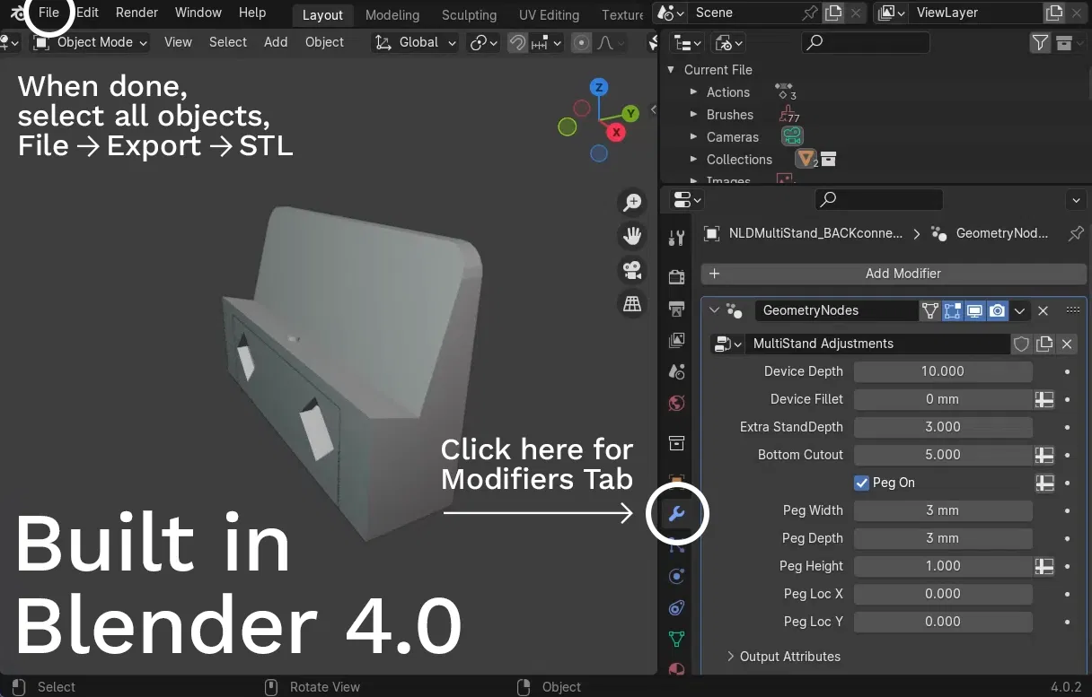 CẬP NHẬT ngày 21 tháng 1: Mình vừa tải lên một file được tạo bằng Blender 4 (phần mềm miễn phí) với tất cả các tùy chọn được tạo theo tham số để bạn có thể dễ dàng tùy chỉnh giá đỡ của mình. Nếu bạn mới dùng blender, hãy xem ảnh để biết cách mở tab Modifiers và cách xuất cơ bản. Bạn có thể xem video demo tại đây. Cái này cũng có thể dùng để làm miếng đệm tùy chỉnh nếu cần. Chỉ cần đặt "Device Depth" thành 0 và sử dụng "Extra Stand Depth" để điều chỉnh kích thước giá đỡ. -- Mình muốn dựng nhiều máy chơi game cầm tay trên bàn theo cách dễ dàng nhấc lên chơi mà không chiếm quá nhiều diện tích. Vì vậy mình đã chế tạo một hệ thống mô-đun, lắp ráp với nhau. Tấm mặt trước, giá đỡ thiết bị, chân sau và các miếng đệm là các bộ phận riêng biệt kết nối với cùng một đầu nối dạng khớp nối. Chúng dễ in, kết nối chắc chắn và dễ thay đổi khi cần. Mình đã đính kèm giá đỡ cho các thiết bị mình dùng, nhưng bạn cứ tự do tạo của riêng mình và chia sẻ nhé. Hiện tại bao gồm các giá đỡ cho: * AYN Odin 1 (tương thích với tay cầm full size và tay cầm slim của mình)