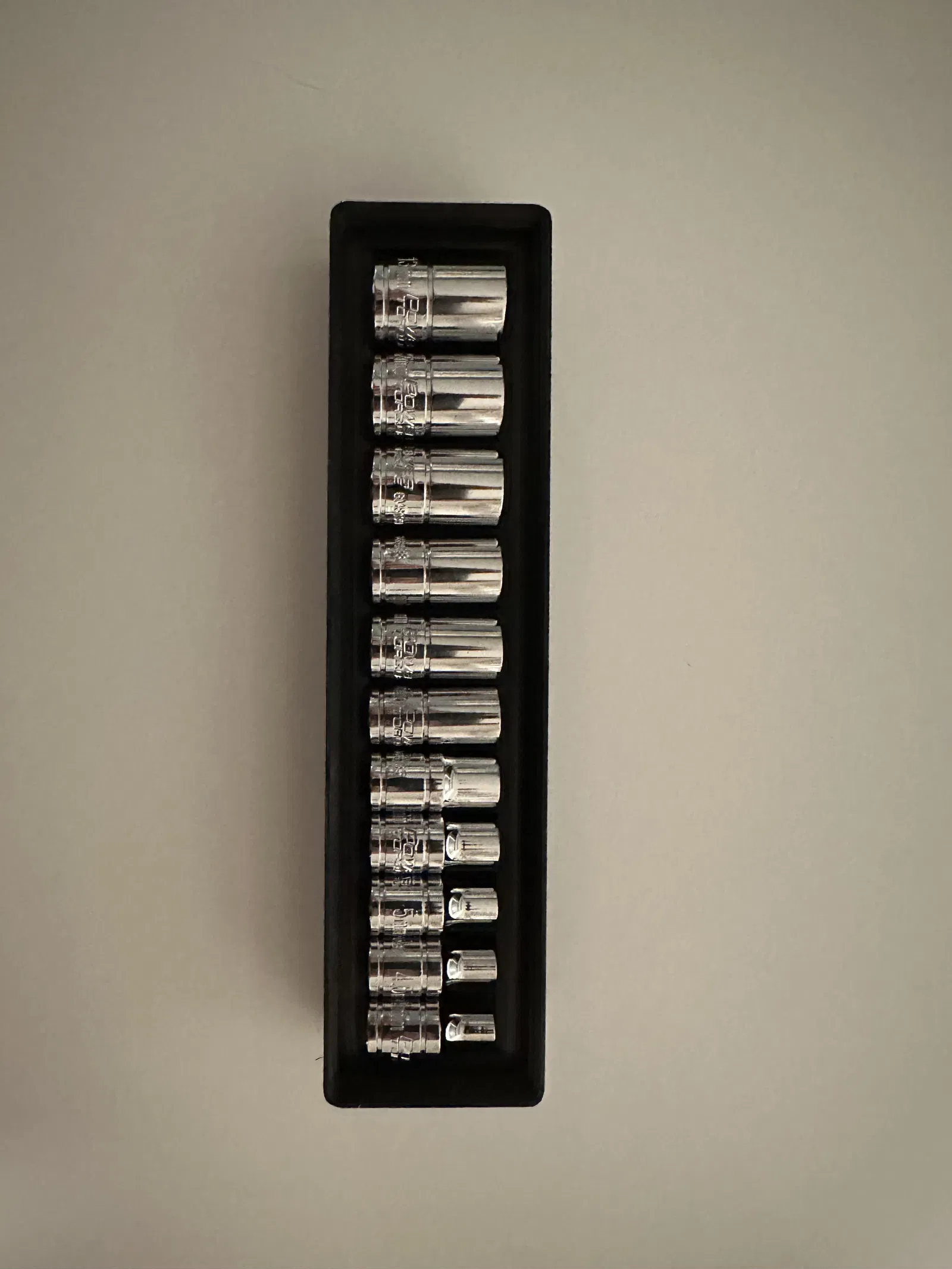 Cái này là khay đựng tuýp mét Power Torque 4mm đến 13mm, chuẩn Gridfinity. Vừa vặn cho bộ tuýp drive 1/4" bạn hay mua ở tiệm phụ tùng xe đó. In ra rồi gắn vô là gọn liền hà!
