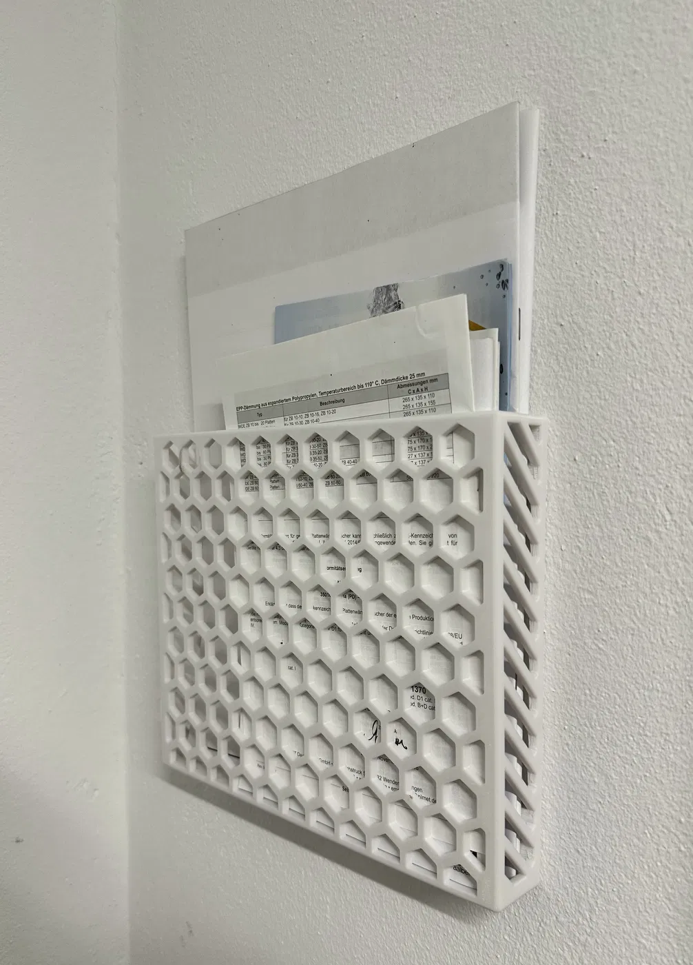 Cần kẹp tài liệu gắn tường mà không tìm được, nên tui tự làm cái này. Nó đựng vừa tài liệu A4, thiết kế tổ ong tiết kiệm vật liệu, dễ dàng gắn tường bằng vít. Tui in bằng PLA, có hướng dẫn support tùy cách in.