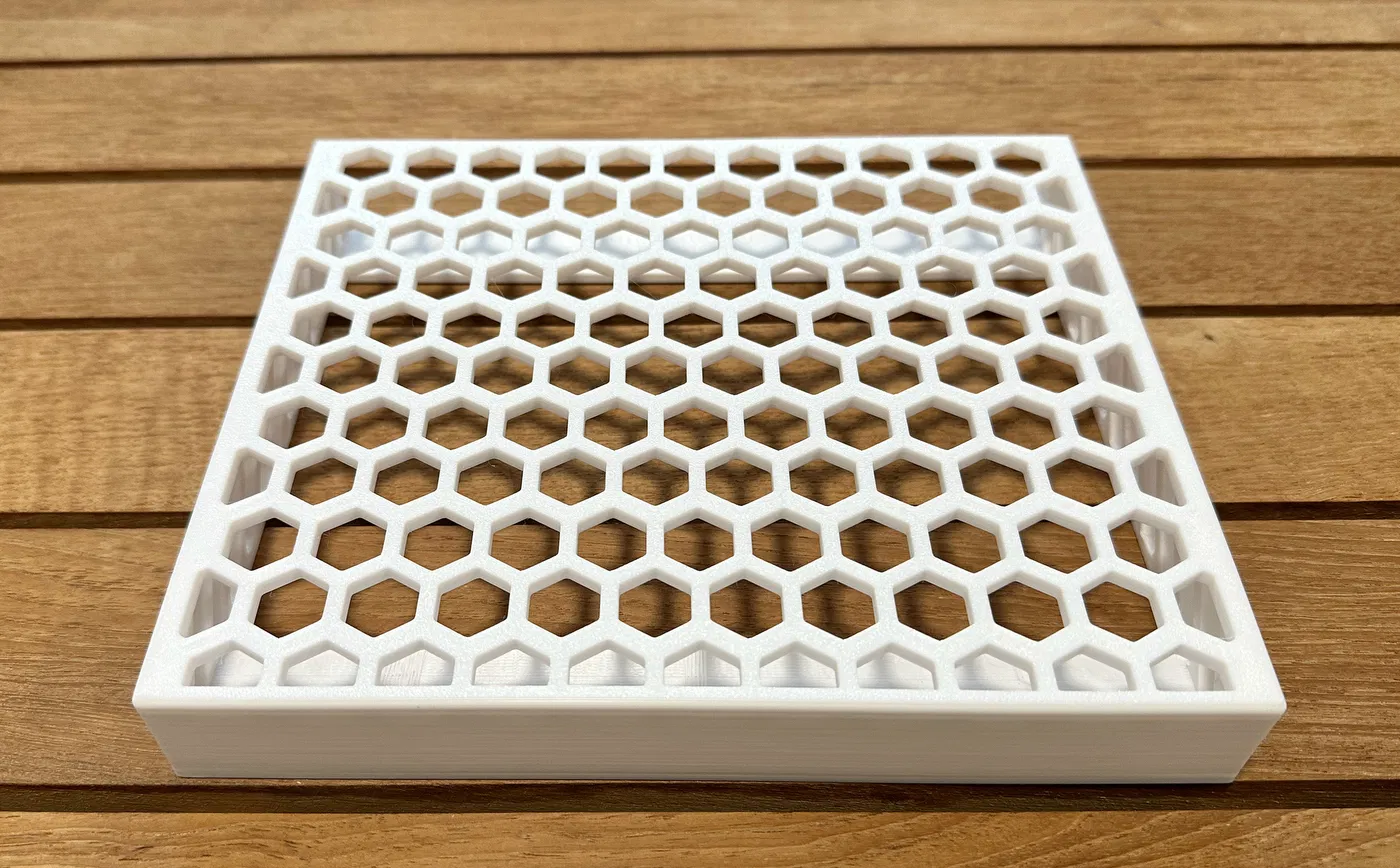 Nó có thiết kế dạng tổ ong để tiết kiệm filament mà vẫn đủ chắc chắn.