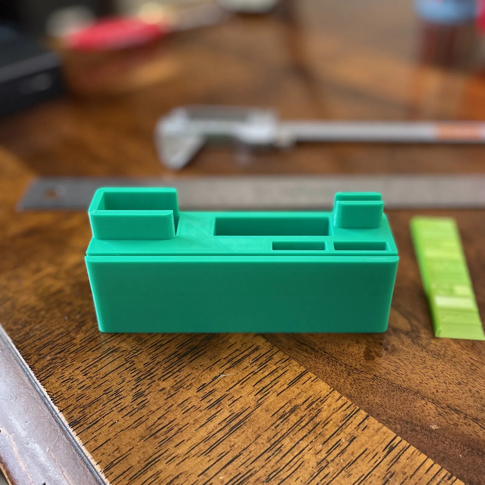 Cái đế để bàn này giúp bạn giữ chặt kìm caliper, thước lá và vài cái kìm đo độ dày. Thiết kế lại để giữ kìm chắc chắn hơn, tránh bị nghiêng đổ. In bằng nhựa PLA màu xanh lá trên máy MK4.