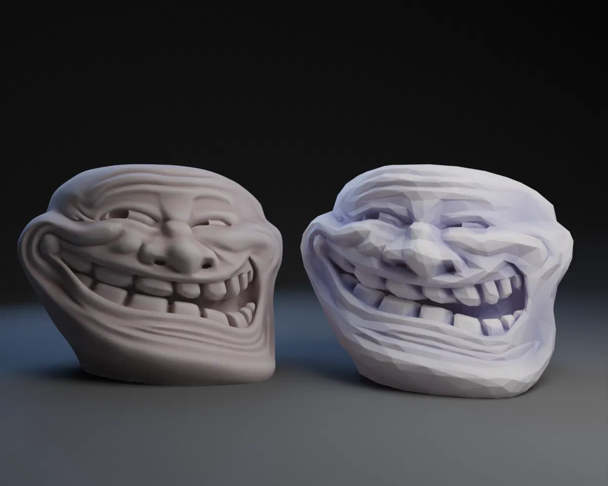 Tải về mô hình 3D Trollface với hai phiên bản: High Poly (chi tiết cao) và Low Poly (chi tiết thấp). Hoàn hảo cho các dự án in 3D, meme và đồ họa.