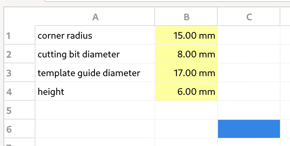 Tôi thích tay cầm bằng gỗ hơn những cái in. Do đó, tôi đã thiết kế một mẫu để tạo ra một tay cầm bằng gỗ bằng cách sử dụng bộ định tuyến và mẫu Guild (vòng sao chép). Tuy nhiên, tôi cũng đã bao gồm tệp Freecad cho phép tham số hóa mẫu cho mẫu hướng dẫn khác nhau và cắt đường kính bit. Xem ảnh chụp màn hình đính kèm.