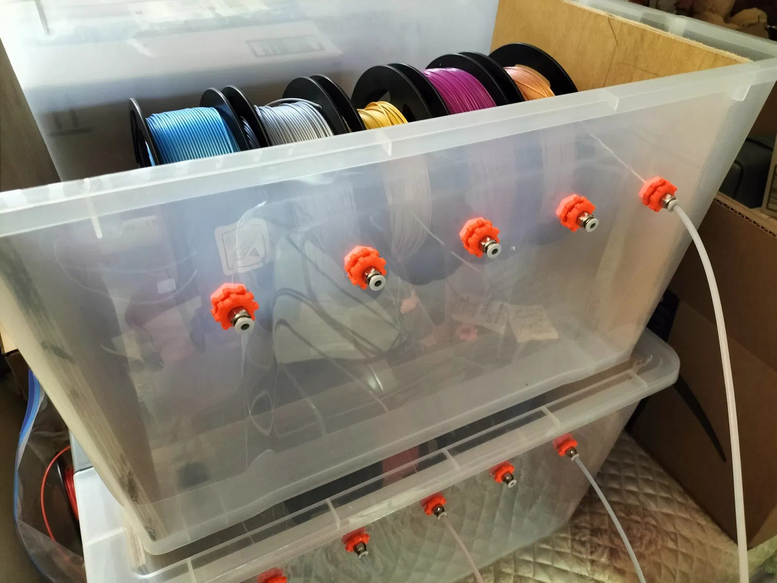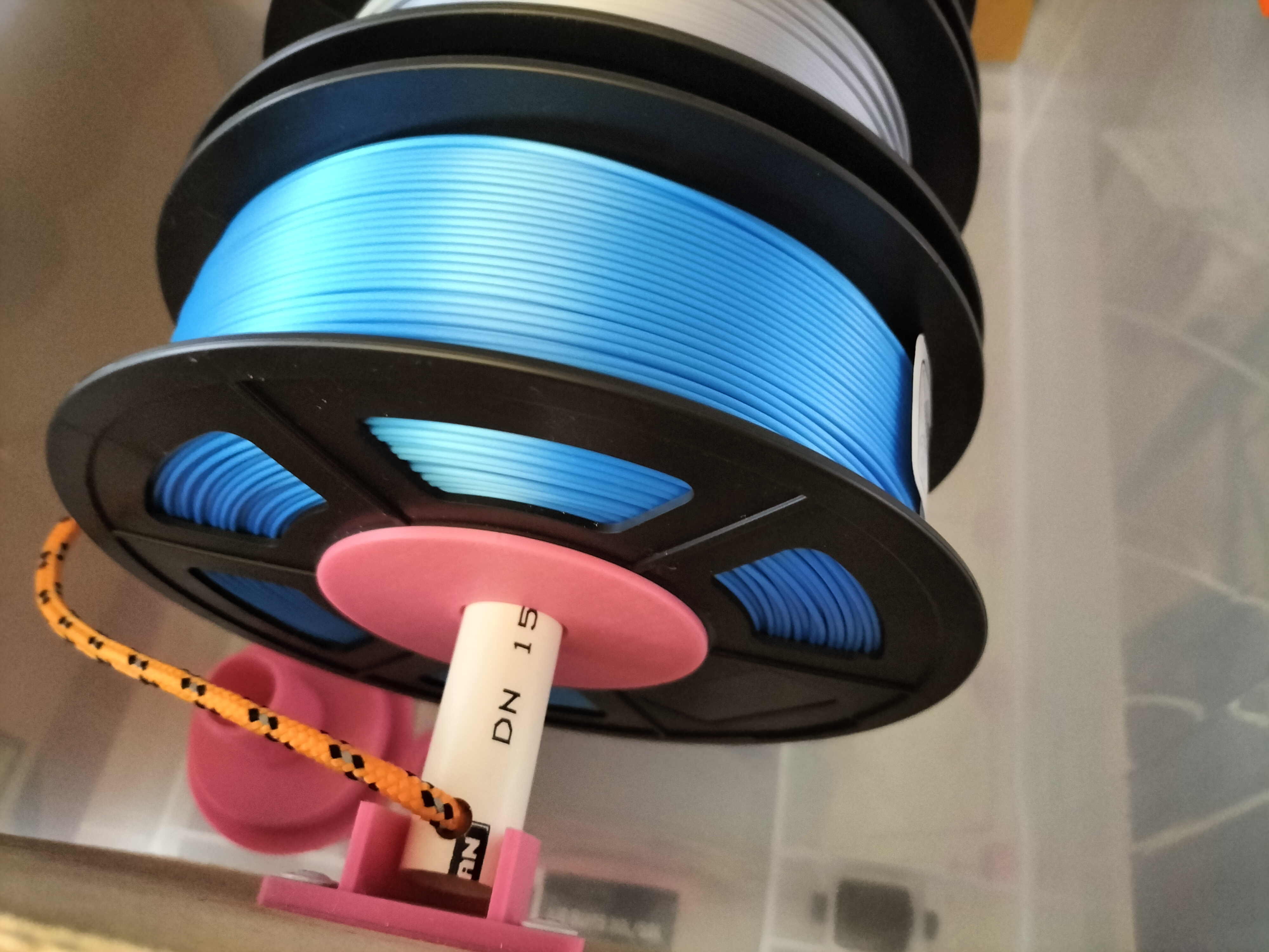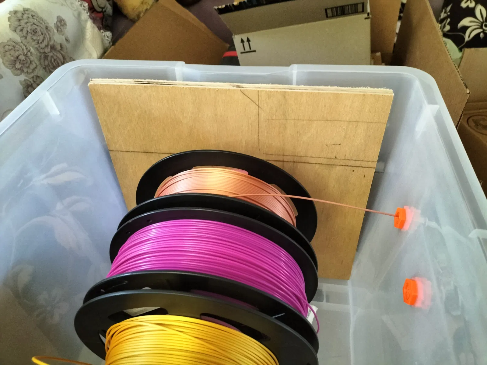 Cách này làm cho filament gần như không bị ma sát khi đi vào bộ đệm, nhưng đủ để nó không bị tuột ra khỏi cuộn chỉ. Mày còn có thể xếp chồng mấy cái thùng này lên nhau để xài filament từ nhiều thùng khác nhau nữa.