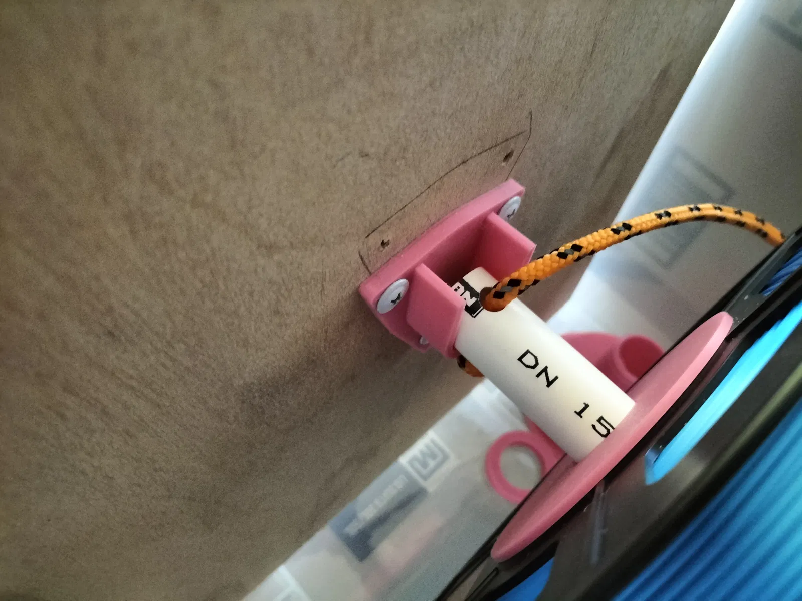 Tao cắt ống PVC ra, rồi khoan lỗ hai đầu ống để xỏ dây dù vô, giúp dễ dàng nhấc cả cụm ra khỏi thùng và cũng để mấy cái cuộn chỉ không bị trượt ra khỏi ống.