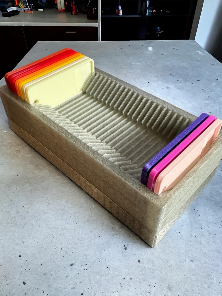 Nắp và các khe cắm bổ sung cho mẫu Fillamentum. Thiết kế này giúp bạn có thêm không gian lưu trữ bằng cách gắn thêm khay khe cắm mới vào hộp mẫu Filament mẫu có sẵn. Có thể in bằng chế độ Input Shaper để tiết kiệm thời gian.