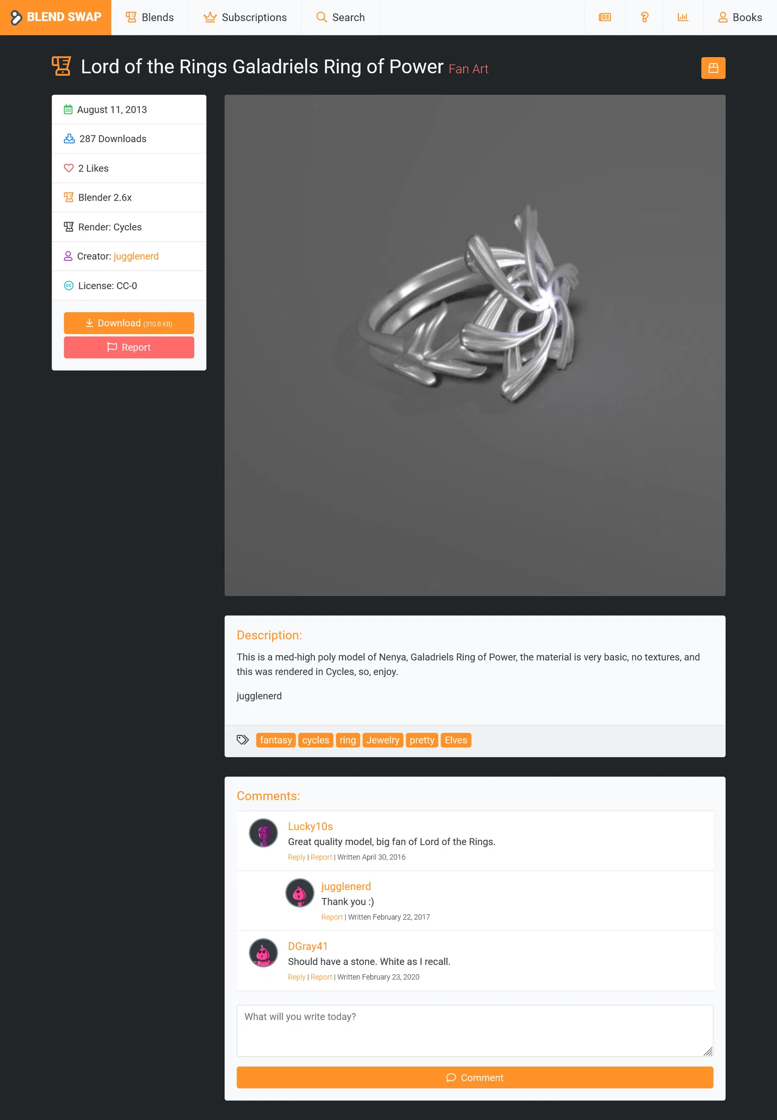 Mô hình Nhẫn Nenya, Chiếc Nhẫn Sức Mạnh của Galadriel trong Chúa tể những chiếc nhẫn, bởi jugglenerd. Ban đầu được tải lên Blend Swap.