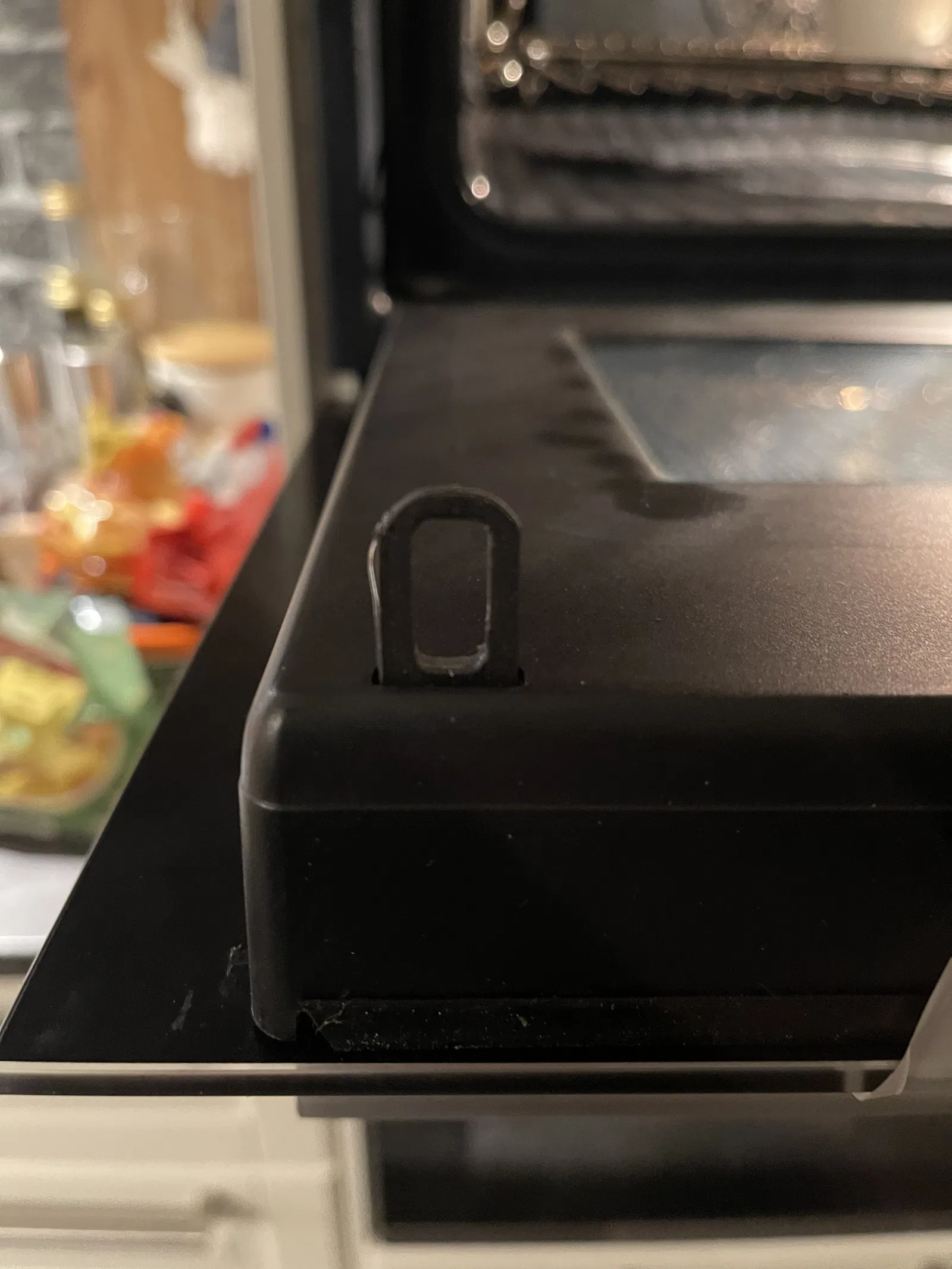 Cách thay thế, nới lỏng 2 ốc ở bản lề, nhấc các lẫy khóa lên, kéo nắp lò ra khỏi lò, nới lỏng 2 ốc cho phần vỏ nhựa, cưa bỏ phần bị gãy, dán lại bằng keo, ví dụ như keo nến.