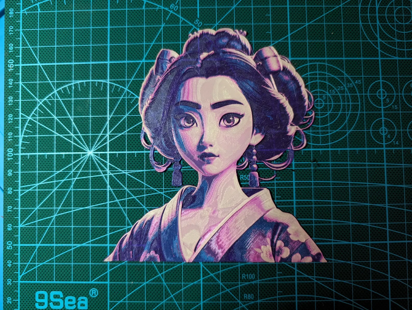 Thử nghiệm HueForge bằng cách sử dụng nghệ thuật do AI tạo ra, mô phỏng Geisha theo phong cách Disney hiện đại. Hình ảnh được tạo bằng Stable Diffusion XL, với các tùy chọn nhựa in và cài đặt cắt khác nhau cho nhiều loại đầu phun.