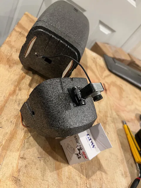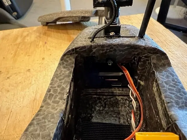 Khoét lỗ phía dưới pát để servo chui vô. Dán cái pát che gió lại. Cắt khe để luồn dây camera và anten. Dán hai cái khe đó lại.