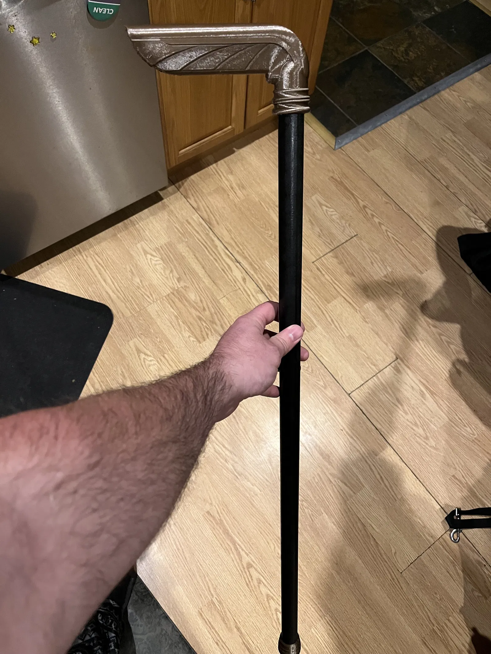 Tui thiết kế cái gậy này để đi chung với bộ đồ kiểu Victorian tui mặc hồi đi dự sự kiện Giáng Sinh "chủ đề Dickens", dù phải nói là niên đại hơi lệch tí xíu cho cái đó và nó giống kiểu Phục hưng Ai Cập thời Art Deco, những năm 20-30 hơn. Ý tưởng là gợi nhớ đến cánh bọ hung; còn tui có làm được hay không thì còn phải bàn cãi, nhưng tui thấy nó ra trông cũng ngầu ngầu.