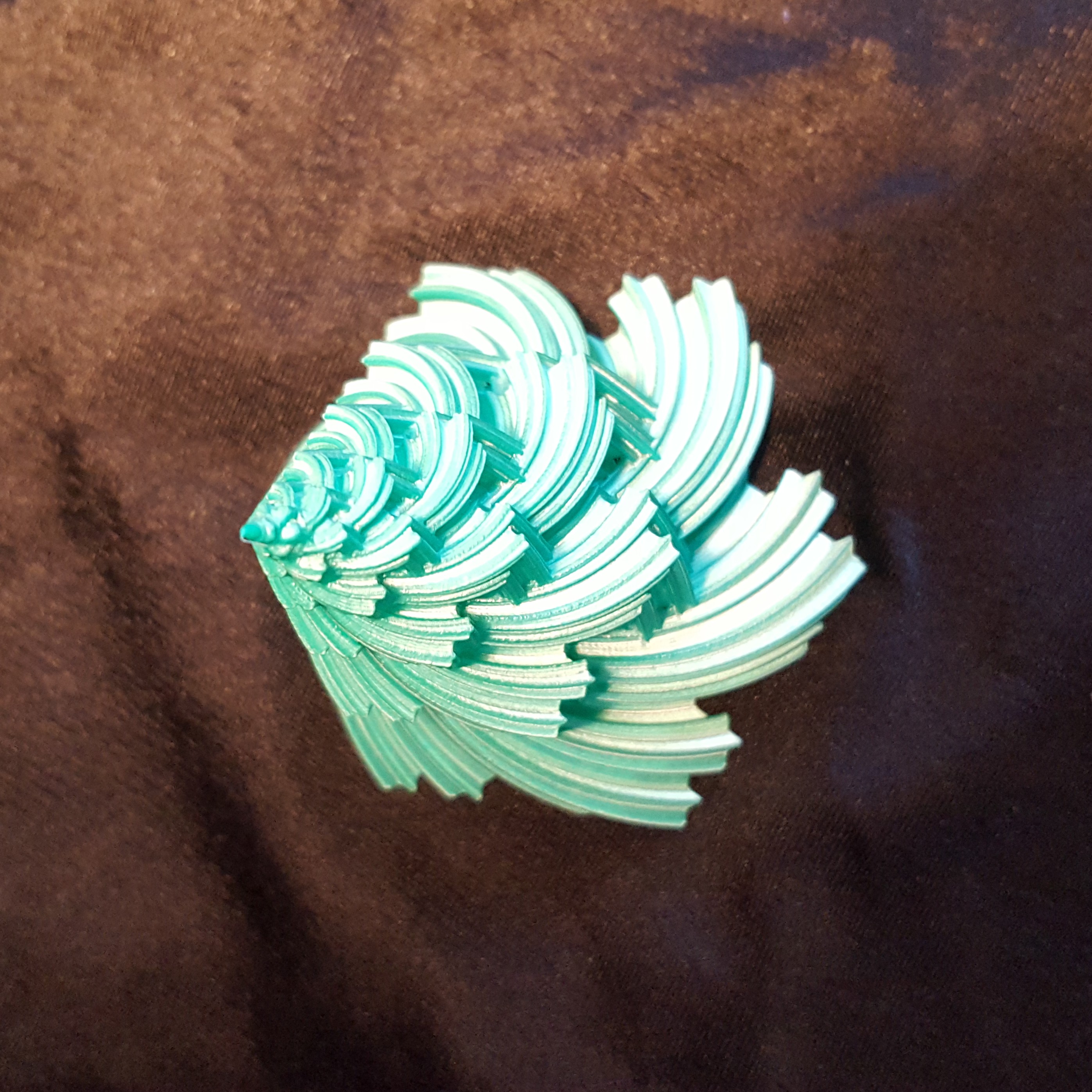 Các bông tuyết Koch có thể xếp khít nhau trên một mặt phẳng. Cây thông này được tạo ra bằng cách thu nhỏ bông tuyết Koch bên ngoài trong khi xoay nó bên dưới để thẳng hàng với bông tuyết bên trong lớn nhất. Trong mô hình này, các vòng xoắn ngược chiều nhau. Sau đó, quá trình này lặp lại với bông tuyết Koch bên trong tiếp theo. In chế độ "vase mode" (chế độ lọ hoa) không cần đáy. Có thể đặt nến tealight vào bên trong vừa vặn. ### Xem các mô hình Giáng sinh khác của mình. ### Các thiết kế xoắn ốc (vase mode) khác mà mình đã làm.